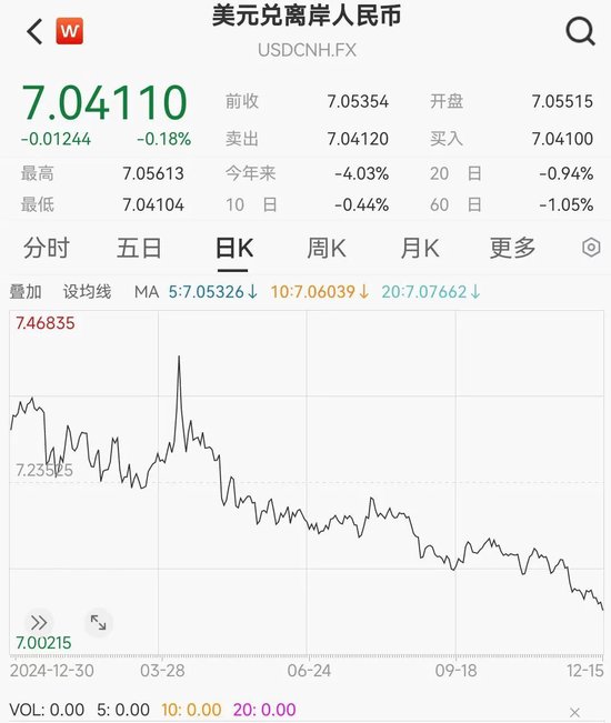 12月15日,人民币汇率显著攀升。截至今晚8时,在岸、离岸人民币对美元汇率双双升破7.05,其中离岸人民币对美元汇率盘中最高升至7.04119,在岸人民币对美元汇率盘中最高升至7.0470,双双创下2024年10月8日以来的新高。