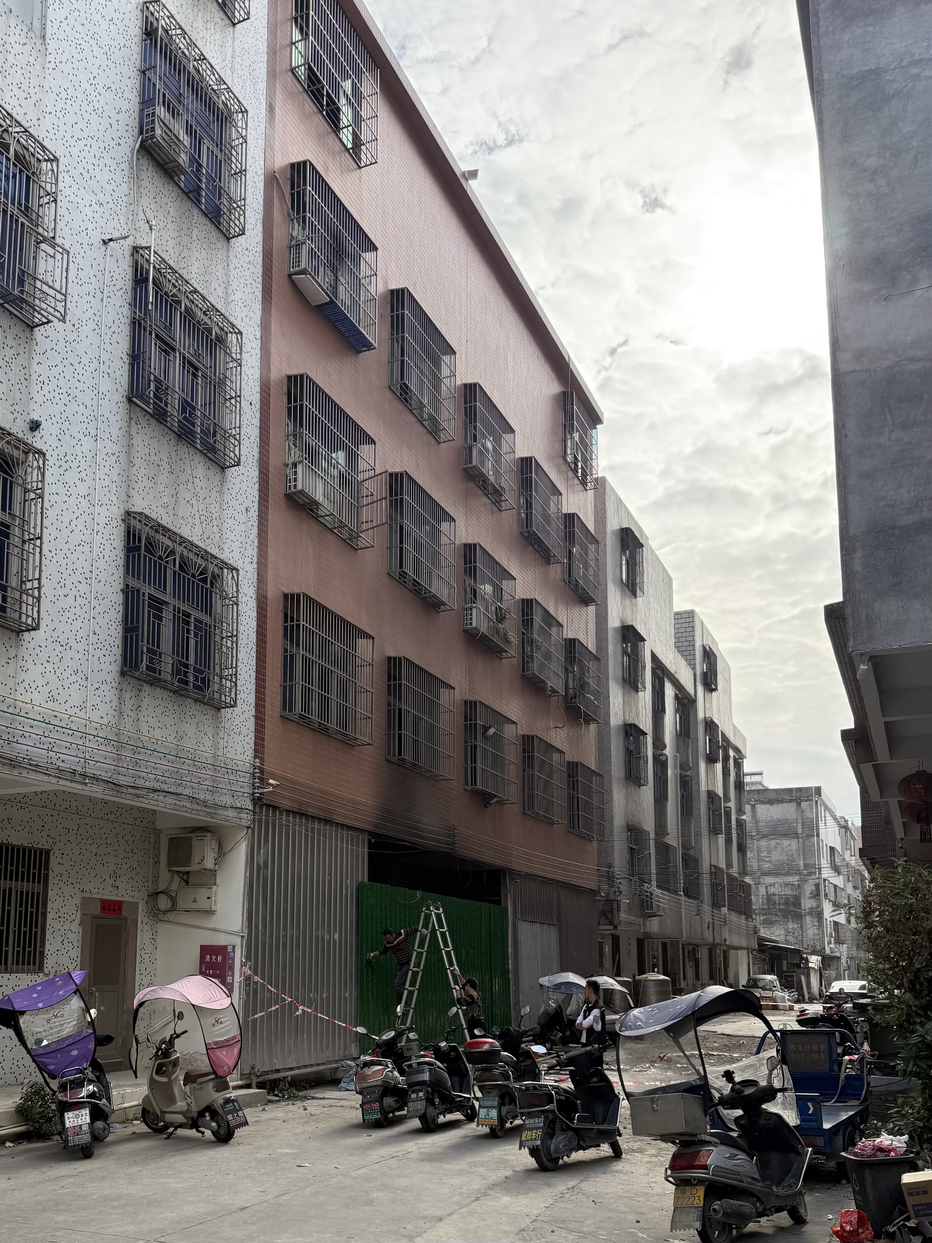 12月10日下午,封面新闻记者见到,消防、应急、公安等部门的工作人员仍在现场开展处置和火灾原因的调查工作,过火建筑的一层被绿色的彩钢板围蔽,火灾在建筑的一层外墙和二层一个窗口的外墙被熏得乌黑。记者注意到,该民房所有的窗户上都安装了防盗网,其中一些防盗网上设置了逃生窗,位于房屋背面三层的一个逃生窗保持着打开的状态,一个防盗网有被破拆的迹象。
